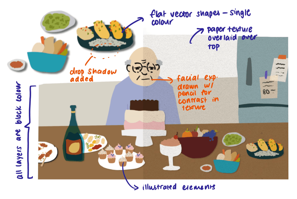I was in charge of the art direction of the project, designing the style, feel and the design of our main character. To personally appeal to both our older and younger demographics, we settled on a felty, papercut style.